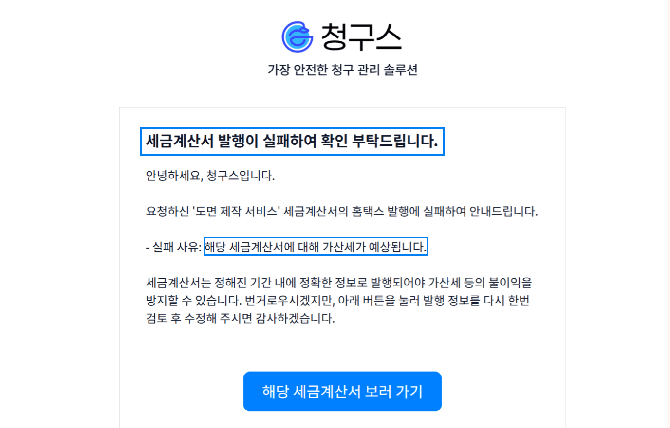 “세금계산서 발행 실패” 안내를 먼저 보내