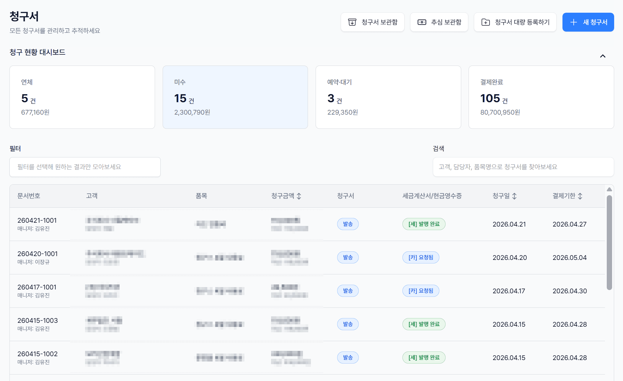 거래처 하나만 등록해서 다음 결산 사이클부터 체험해 보세요. 첫 청구서 보내는 데 3분이면 됩니다.