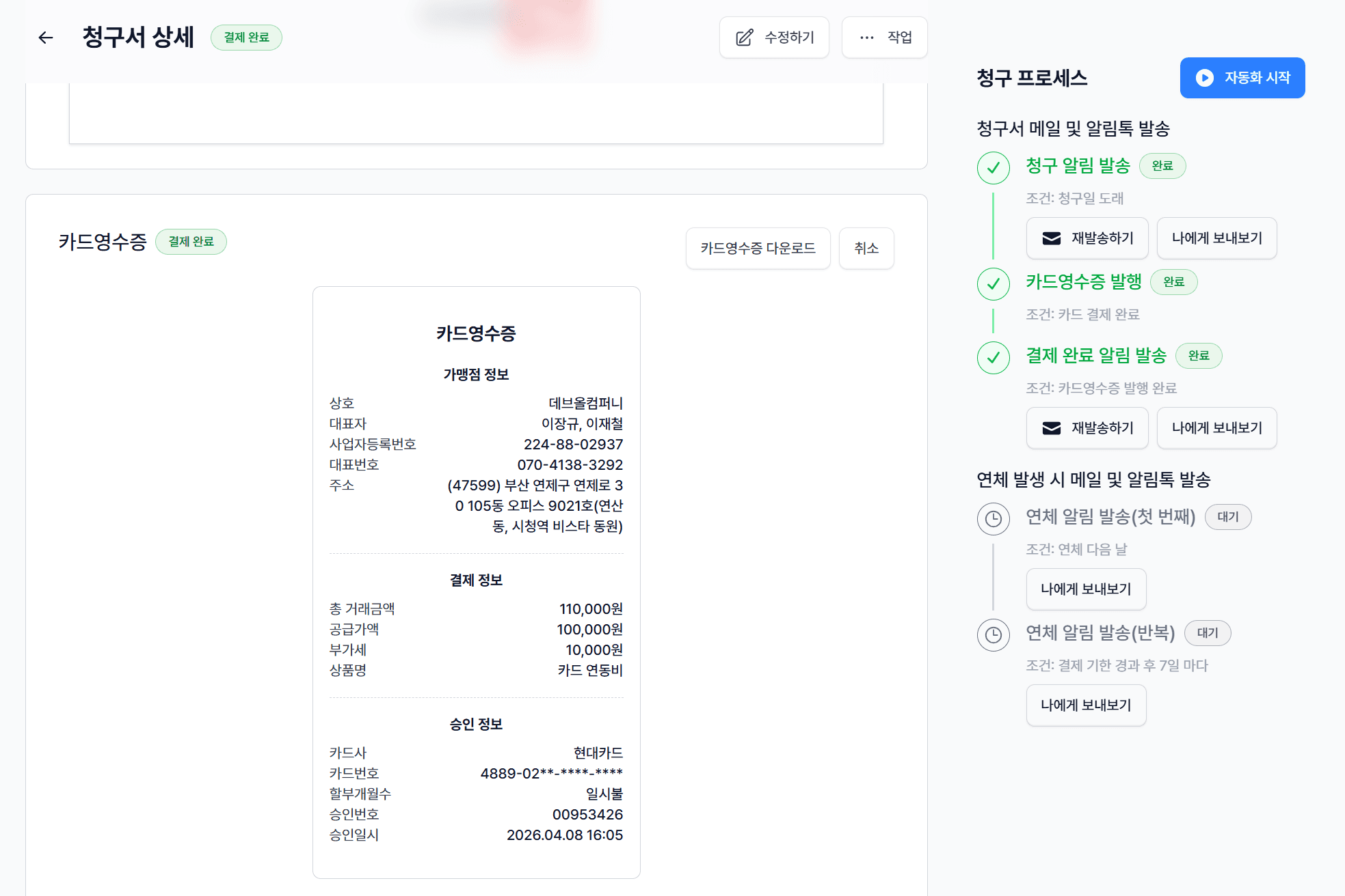 청구서 발송 → 결제 → 입금 확인 → 세금계산서까지 한 흐름 — 수작업 제거