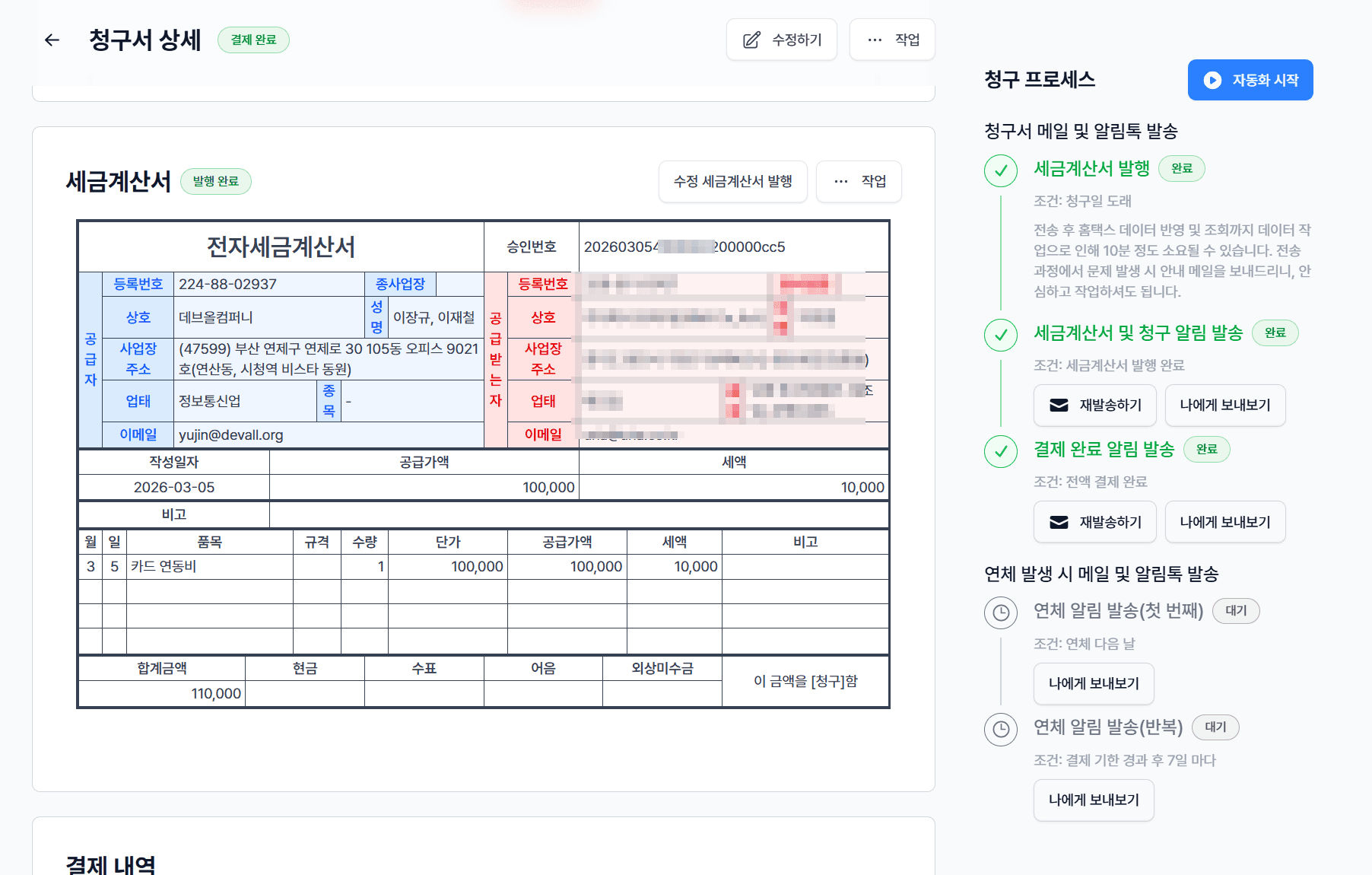거래명세서 발행부터 세금계산서 연동까지, 수작업으로 하면 날짜 실수가 생길 수밖에 없습니다.