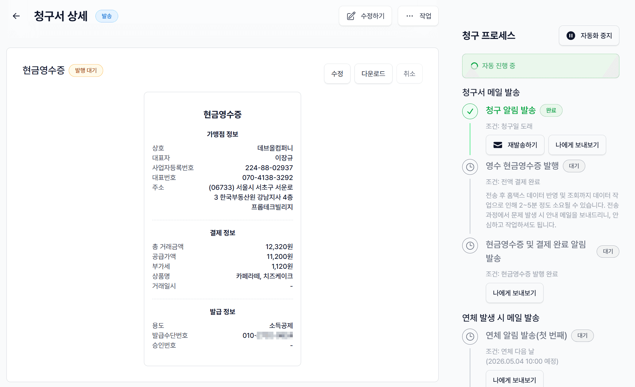 청구스는 청구서 발행 → 세금계산서 자동 연동 → 현금영수증 자동 발행 → 입금 확인 → 미수 자동 리마인드를 한 흐름으로 묶습니다. 10만원 이상 현금 거래가 들어오면 시스템이 자동으로 의무발행 여부 판단하고 건별로 처리해요. 대표님이 "이거 발행 대상이었나?" 고민할 일 자체가 사라집니다.