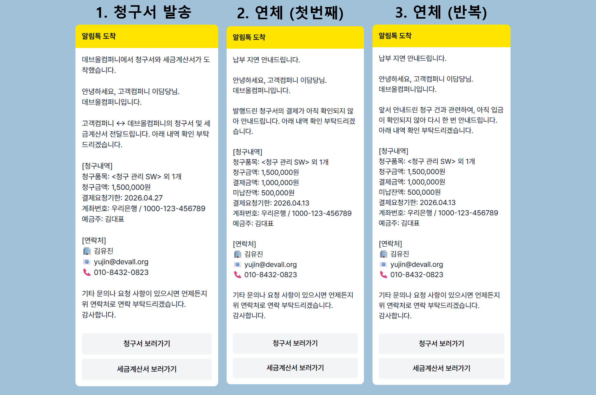 매번 결제일 챙기고, 단계별로 메일 다르게 쓰고, 카톡까지 보내는 일… 거래처 30곳만 넘어가도 머리로 절대 안 돌아갑니다.