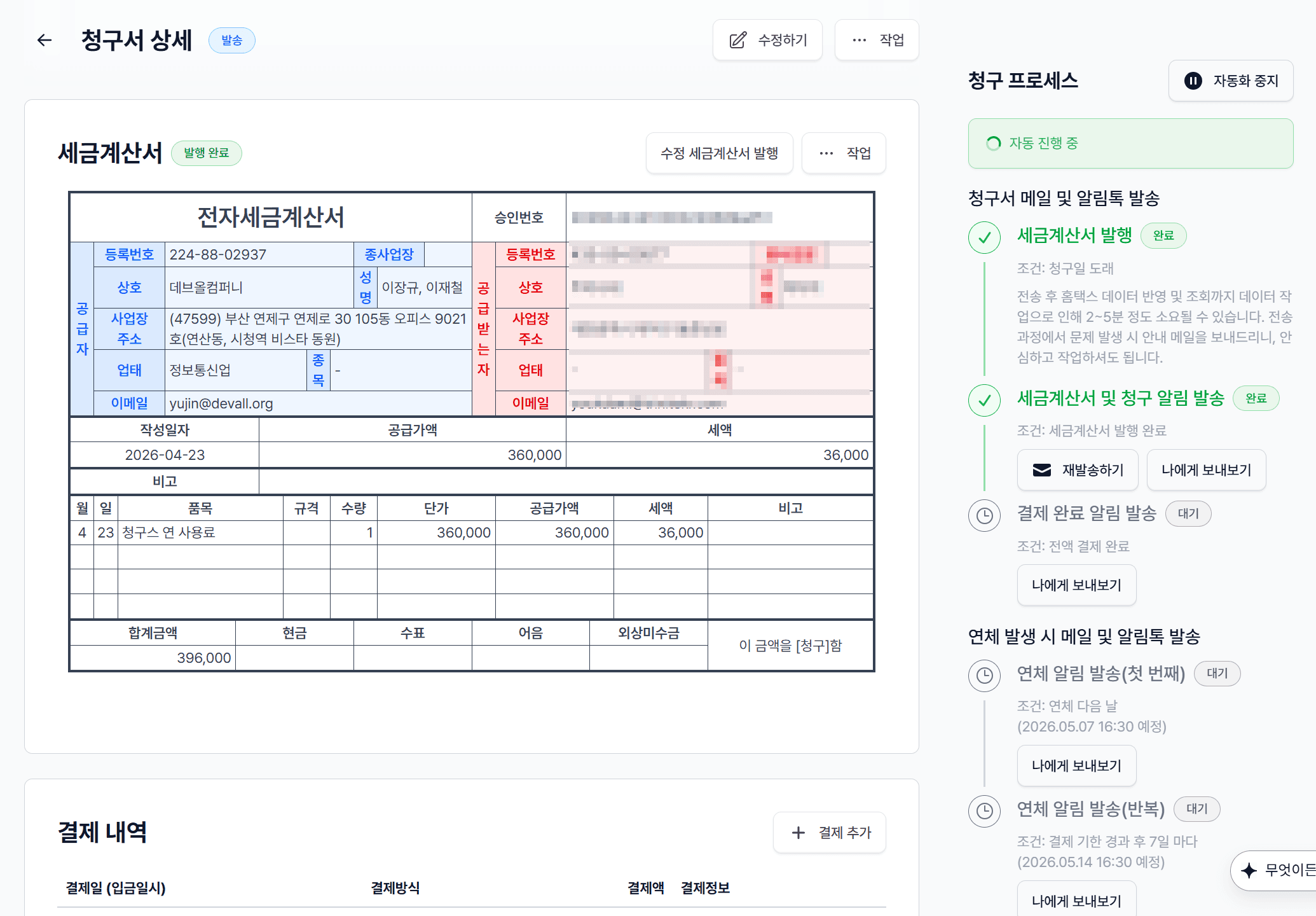 청구스는 청구서 발송 → 세금계산서 자동 발행 → 입금 자동 확인까지 한 화면에서 자동으로 기록됩니다. 발행한 세금계산서와 실제 입금 이력이 자동으로 매칭되니까, 결산·세무 신고 시즌에 따로 자료를 모을 필요가 없어져요.