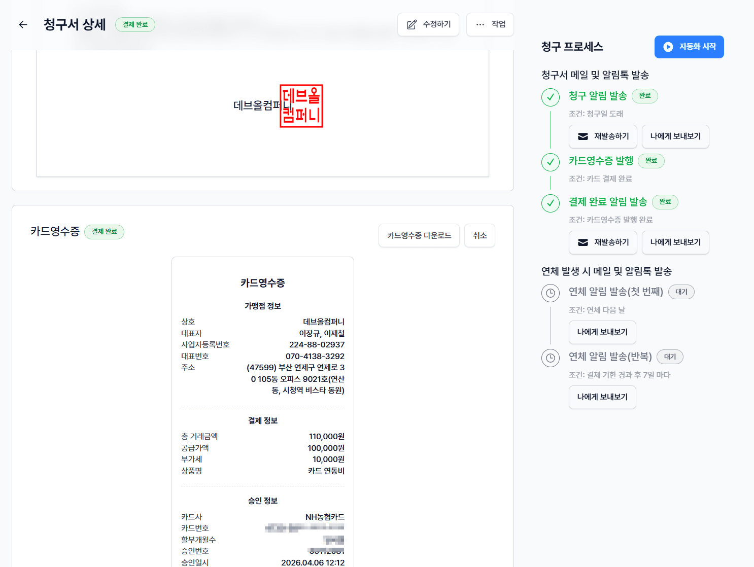 그 답은 중간에 PG사가 한 단계 더 끼어 있기 때문이에요. 청구스는 PG사를 거치지 않고 카드사와 직접 연결해서 결제를 받습니다. 중간 마진이 빠지니까 같은 카드 결제를 받아도 수수료가 최대 1.5% 저렴합니다. 거래처한테 링크 하나 보내면 바로 카드 결제가 되고, 입금 확인·세금계산서 발행까지 자동이에요.
